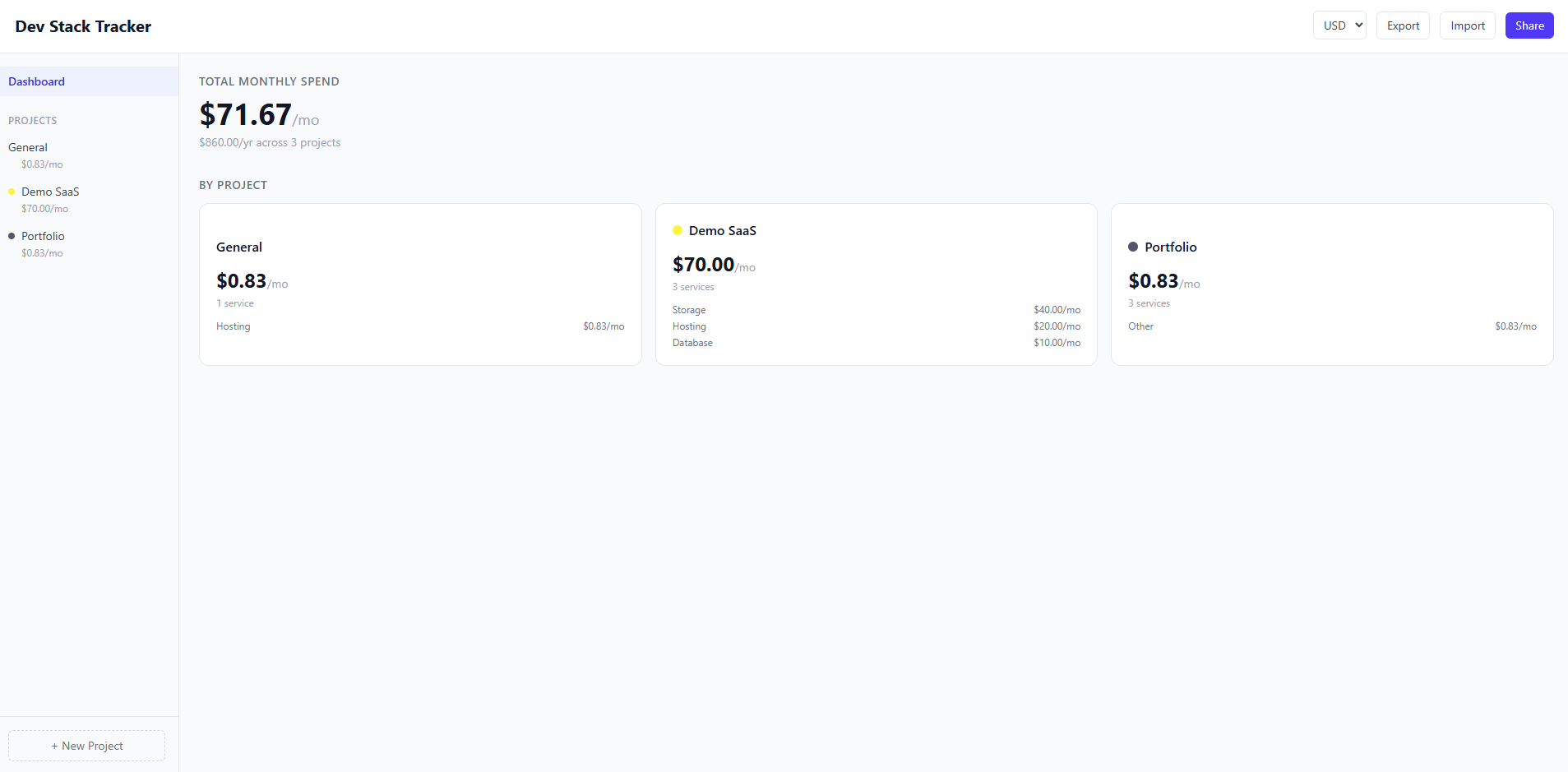 I built Dev Stack Tracker because I was losing track of what I was actually paying for across different services. Between personal projects, side projects with friends, and shared infrastructure, costs were scattered across dashboards I rarely checked. A few friends had the same problem, and since some of us were collaborating on projects together, there was natural overlap in the services we were tracking — which made it even harder to keep things straight. I wanted something fast and lightweight that anyone could open and immediately start using, with no sign-up friction and nothing stored on a server. The goal was a tool that felt simple on the surface but was genuinely useful: organize services by project, see your totals, and share your setup with someone in one click.